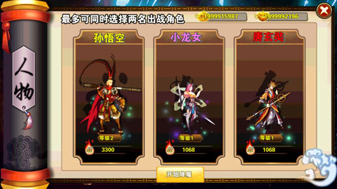 相比于普通的横版闯关游戏,独创的双角色切换玩法,玩家可以从孙悟空、小龙女和唐玄奘之中选择两个角色进行出战。