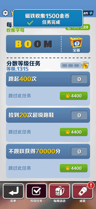 在遇到累计捡到15个喷气背包或者捡到10次磁铁这种任务的时候,我们只需要多去进行跑酷,通过多多的磨练对局,就可以很简单的完成指标,这一类任务主要是得肝,花时间花精力才可以完成。